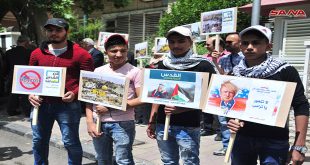 في سياق متصل خرج الآلاف من الفلسطينيين في مظاهرات احتجاجية في مدن نابلس ورام الله والخليل وبيت لحم ضد محاولات نقل السفارة الأميركية إلى القدس المحتلة رافعين الاعلام الفلسطينية وشعارات “القدس هي مفتاح السلام والحرب” و”لا لنقل السفارة الامريكية إلى مدينة القدس” و”نقل السفارة الأمريكية يعتبر وعد بلفور جديدا للشعب الفلسطيني” و”نقل السفارة يعتبر انهاء لعملية السلام”.