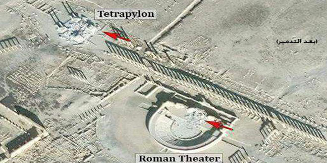 وذكرت مصادر أهلية من داخل مدينة تدمر لمراسل سانا في حمص أن “إرهابيي تنظيم داعش عمدوا إلى تفخيخ واجهة المسرح الروماني والمصلبة (التترابيلون) المؤلفة من 16 عمودا في الشارع الرئيسي بالمدينة الأثرية وفجروها ما أدى إلى تدميرها”.