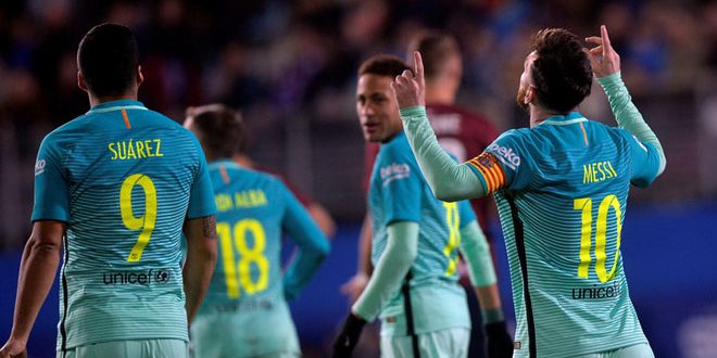 وسجل أهداف برشلونة دينيس سواريز “هدفين” ثم أضاف ميسي الهدف الثالث فيما اختتم نيمار الرباعية.