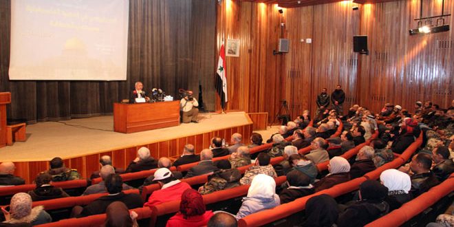 وأكد الجدعان أن السوريين والفلسطينيين شعب واحد وأخوة دم وتراب وماض وحاضر ومستقبل وأن قضيتهما واحدة وصراعهما واحد ونضالهما مشترك لافتا إلى أن ما تتعرض له سورية من اعتداء ممنهج ومبيت يأتي من نفس العدو ومن نفس القوى الاستعمارية في أمريكا وفرنسا وبريطانيا و”إسرائيل” وبعض العرب تنفيذا لإرادة صهيونية استعمارية بهدف تدمير سورية وما تحمله من قيم وما تمثله من مقاومة لمخططاتهم في الهيمنة والسيطرة على المنطقة ومستقبلها. وأوضح الجدعان أن سورية صمدت لأنها على حق وستنتصر بعزيمة شعبها وجيشها وقيادتها كما ان فلسطين ستنتصر على أعدائها.