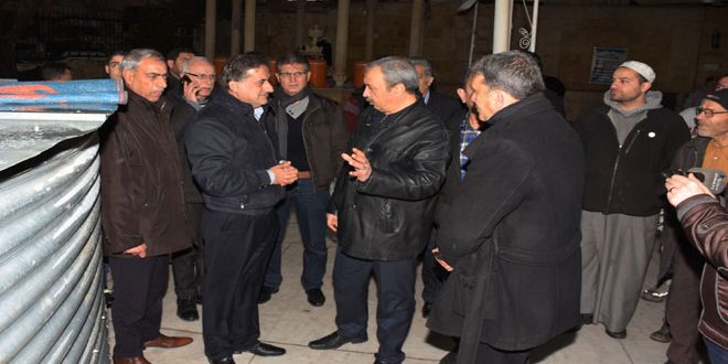 كما تفقد المحافظ اليوم عمليات الصيانة والتأهيل الجارية في حي صلاح الدين بمدينة حلب واطلع على ما أنجزته الورشات الفنية من فتح الشوارع الرئيسية والفرعية وترحيل الأنقاض من دوار صلاح الدين باتجاه حي المشهد وشارع الألبسة.