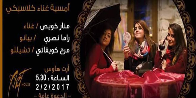 تستضيف صالة الآرت هاوس أمسية غناء كلاسيكي عند الخامسة والنصف من مساء الخميس القادم تحييها المغنية منار خويص ويرافقها كل من الموسيقيتين راما نصري على البيانو ومرح كويفاتي على التشيللو.
