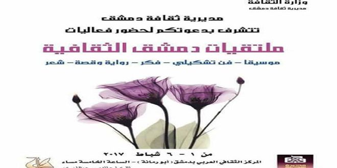 تنطلق عند الساعة الخامسة من مساء الأربعاء المقبل الدورة الثانية من ملتقيات دمشق الثقافية التي تنظمها مديرية ثقافة دمشق وتشمل الموسيقا والفن التشكيلي والفكر والرواية والقصة والشعر وذلك في المركز الثقافي العربي بابو رمانة.