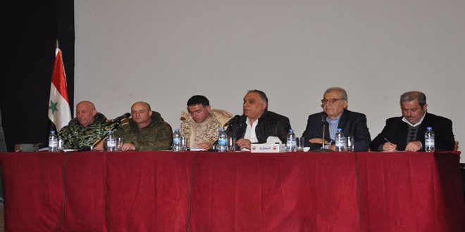 وأكد محافظ حمص طلال البرازي خلال الاجتماع “أهمية اللقاءات مع الفعاليات الاجتماعية والدينية والمؤسسات الرسمية بهدف تعزيز عملية الالتحاق بالفيلق الخامس الطوعي” منوها بالتجاوب الكبير من المشاركين في اللقاءات من اجل تعزيز التطوع بتشكيلات الفيلق الخامس للمساهمة في اجتثاث الإرهاب التكفيري.