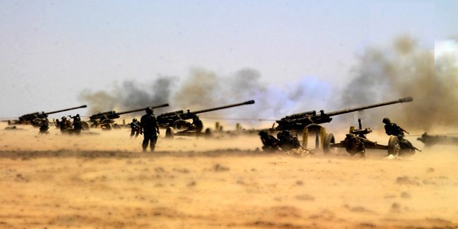 وذكر مراسل سانا في دير الزور أن وحدة من الجيش قصفت بالمدفعية الثقيلة وراجمات الصواريخ تجمعا لتنظيم “داعش” في محيط جبل الثردة بالريف الجنوبي ما أسفر عن تدمير آلية مزودة برشاش ثقيل ومقتل عدد من إرهابييه.