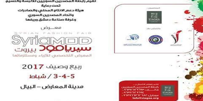 تنطلق غدا الجمعة في مركز البيال للمعارض الدولية في العاصمة اللبنانية بيروت فعاليات المعرض التخصصي للألبسة ومستلزماتها سيريا مود وذلك بمشاركة نحو 125 شركة سورية متخصصة بالألبسة والنسيج ومستلزمات الإنتاج.