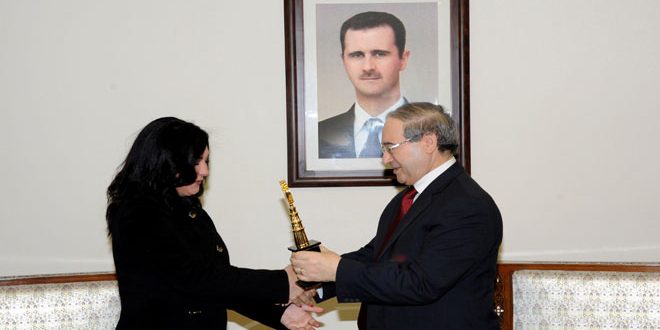 الدكتور فيصل المقداد يكرم الفنانة والمخرجة السورية سلاف فواخرجي