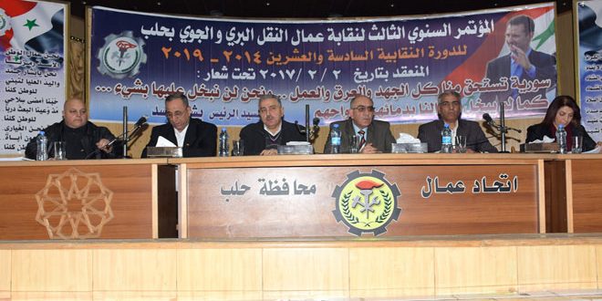 وفي حلب دعا أعضاء مؤتمر نقابة النقل البري والجوي الى ضبط تسعيرة البولمانات العاملة على الخطوط الخارجية وإلغاء المخالفات المفروضة على السيارات الشاحنة العاملة على خطوط المدن ومنح الحوافز الإنتاجية لعمال مديرية النقل وتوسيع ملاك مديرية النقل وملء الشواغر في الدوائر التابعة للنقابة ومنح مكاتب الطيران الخاصة العمولة المتعارف عليها وتعديل صندوق المساعدة الاجتماعية ورفد مدينة حلب بباصات النقل الداخلي لتخديم كل الأحياء.
