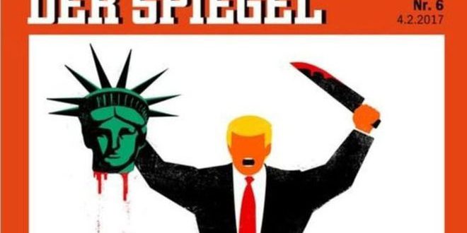 وقال رئيس تحرير المجلة كلاوس برينكباومر لوكالة الانباء الألمانية “على غلافنا يقطع الرئيس الاميركي رأس الرمز الذي يرحب بالمهاجرين واللاجئين في الولايات المتحدة منذ 1886 ومعه الديمقراطية والحرية”.
