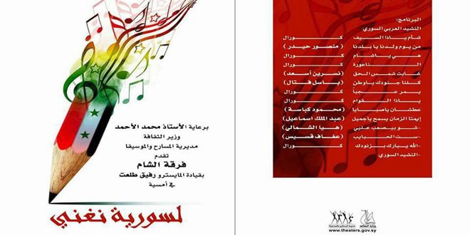تحيي فرقة شام الموسيقية بقيادة المايسترو رفيق طلعت عند الساعة الرابعة من يوم غد أمسية موسيقية بعنوان “لسورية نغني” بالتعاون مع مديرية المسارح والموسيقا على خشبة مسرح الحمراء بدمشق.