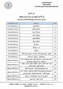 أعلنت المؤسسة العامة لمياه الشرب و الصرف الصحي في محافظة دمشق أنه سيتم تزويد أحياء مدينة دمشق ومحيطها بالمياه ليوم الاثنين 6 – 2 – 2017 وفق الجدول التالي: