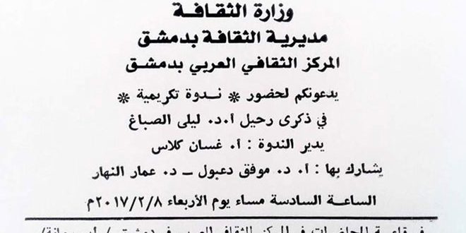 يقيم المركز الثقافي العربي في ابو رمانة عند السادسة من مساء يوم غد ندوة تكريمية للدكتورة ليلى الصباغ في الذكرى الرابعة لرحيلها التي يديرها الباحث غسان كلاس بمشاركة الدكتورين موفق دعبول وعمار النهار.