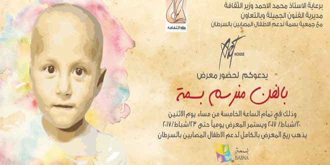 تستضيف صالة “آرت هاوس” بدمشق عند الساعة الخامسة من مساء يوم الاثنين المقبل المعرض الفني “بالفن منرسم بسمة” لدعم الأطفال المصابين بالسرطان بالتعاون مع مديرية الفنون الجميلة في وزارة الثقافة وجمعية “بسمة” لدعم الأطفال المصابين بالسرطان.