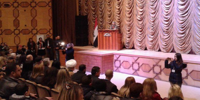 وألقى الشاعر أيمن أسعد قصيدة أهداها للجيش العربي السوري والجرحى الحاضرين تقديرا لعطائهم دفاعا عن الوطن بمواجهة أشرس هجمة إرهابية يتعرض لها.