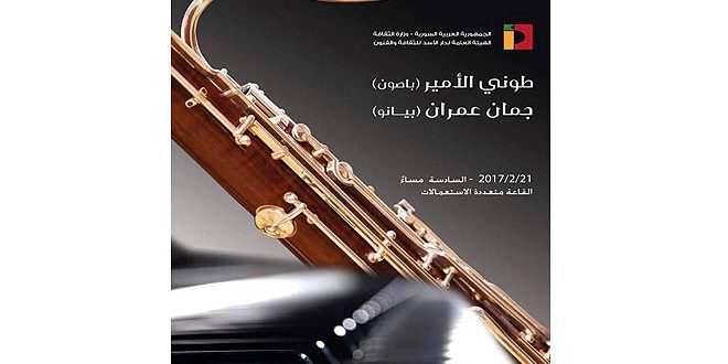 يجمع الموسيقيين طوني الأمير على آلة الباصون وجمان عمران على آلة البيانو حفل موسيقي مشترك عند السادسة من مساء الثلاثاء القادم في القاعة متعددة الاستعمالات بدار الأسد للثقافة والفنون.
