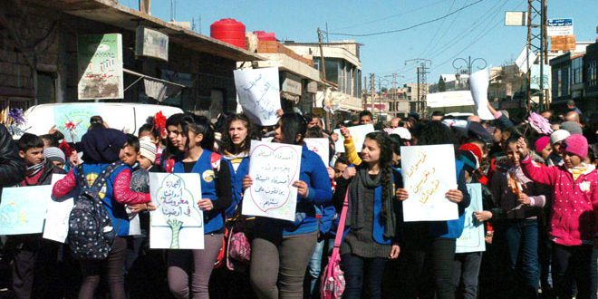 بمشاركة فعاليات أهلية ودينية وشبيبية ورياضية وممثلين عن المنظمات الشعبية نظمت جمعية أصدقاء البيئة بالسويداء اليوم مسيرا بيئيا في بلدة الكفر وذلك ردا على التعديات التي طالت الثروة الحراجية.