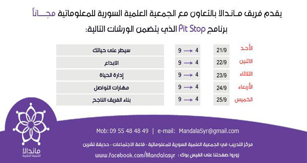 أطلق فريق ماندالا للتنمية البشرية بالتعاون مع عيادات العمل في جامعة دمشق برنامجه التدريبي سيلفي بهدف تطوير مهارات الشباب السوري مستخدما التدريب كاحدى الركائز الاساسية الهادفة للتغيير الايجابي.