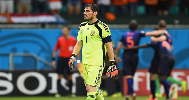 كانت ردود فعل أبرز الصحف الدولية قوية بعد الهزيمة المذلة التي تلقاها حامل لقب كأس العالم منتخب إسبانيا في مباراته الإفتتاحية بالمجموعة الثانية أمام هولندا 1-5 في مونديال 2014 بالبرازيل.