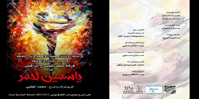 تقيم مديرية المسارح والموسيقا وزارة الثقافة عند الساعة السادسة من مساء غد العرض المسرحي الراقص “ياسمين أحمر” لفرقة خطى وذلك على خشبة مجمع دمر الثقافي.