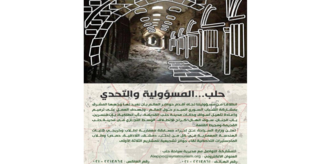 أعلنت وزارة السياحة عن إجراء مسابقة معمارية لطلاب وخريجي كليات الهندسة المعمارية في كل من “حلب ودمشق واللاذقية وحمص وطلاب” الماجستيرات التخصصية بهدف ترميم وإعادة تأهيل أسواق وخانات مدينة حلب القديمة لقاء جوائز تشجيعية للمشاريع الثلاثة الأولى.