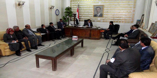 بحث محافظ الحسكة جايز الحمود الموسى اليوم مع وفد من منظمة برنامج الغذاء العالمي العامل في سورية سبل تعزيز التعاون ولا سيما في مجال إقامة مشاريع صغيرة للأسر المحتاجة تؤءمن لهم دخلا ماليا مستمرا .