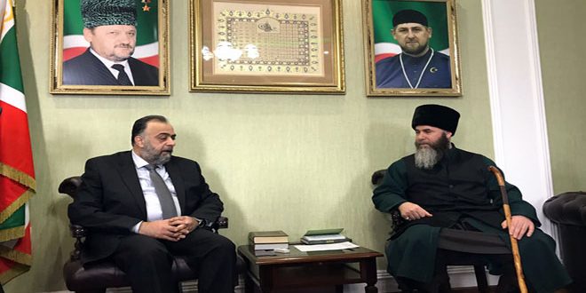 بحث وزير الأوقاف الدكتور محمد عبد الستار السيد مع مفتي الشيشان الشيخ صالح محمد صلاح ومستشار الرئيس الشيشاني آدم شهيدوف تعزيز التعاون بين المؤسستين الدينيتين في سورية والشيشان.