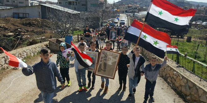 وخلال الوقفة أصدر أهالي الجولان المحتل بيانا تلقى مكتب سانا بالقنيطرة نسخة منه أكدوا فيه “أن أبناء الجولان لم ولن يضلوا الطريق الوطني المشرف الذي خطه الآباء والأجداد بدمائهم الطاهرة وأن ربيع آذار سيزهر نصرا على الصهاينة والإرهاب” لافتين إلى أن شمس قاسيون ستشرق على ربوع الجولان معلنة بداية أمل جديد بتحرير كل شبر من أرضنا المحتلة.