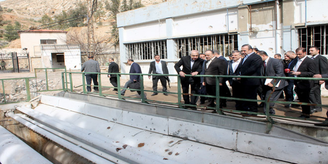 زار فريق حكومي برئاسة المهندس عماد خميس رئيس مجلس الوزراء صباح اليوم نبع عين الفيجة الحيوي غرب دمشق واطلع على الأعمال الجارية لإعادة تأهيل البنى التحتية لمنشأة النبع وتأمين عودة المياه إلى المواطنين في مدينة دمشق ومحيطها.