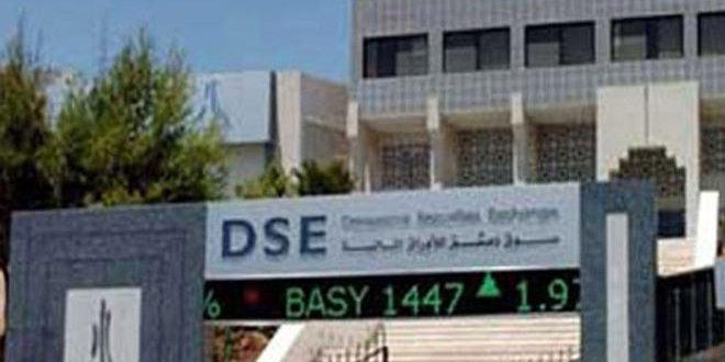 أغلقت جلسة تداولات سوق دمشق للأوراق المالية اليوم على حجم تداول قدره /65007/ أسهم موزعة على 89 صفقة بقيمة تداولات إجمالية بلغت 392ر26 مليون ليرة وانخفض مؤشر السوق 25ر1 نقطة عن الجلسة الماضية حيث أغلق على قيمة 16ر2823 نقطة وبنسبة تغير سالبة قدرها 04ر0 بالمئة.