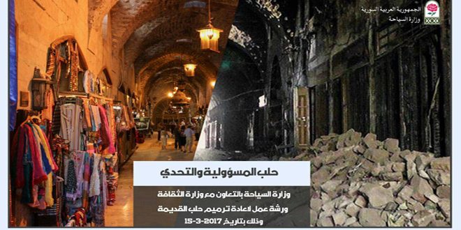 في إطار توحيد الرؤى لمرحلة إعادة ترميم وإعمار مدينة حلب القديمة وفق تصورات وخطط عمل مشتركة بين مختلف القطاعات تعقد وزارتا السياحة والثقافة بالتعاون مع منظمة الأمم المتحدة للتربية والثقافة والعلوم ” اليونيسكو ” غدا ورشة عمل ” المسؤولية والتحدي ” في فندق شهبا حلب.