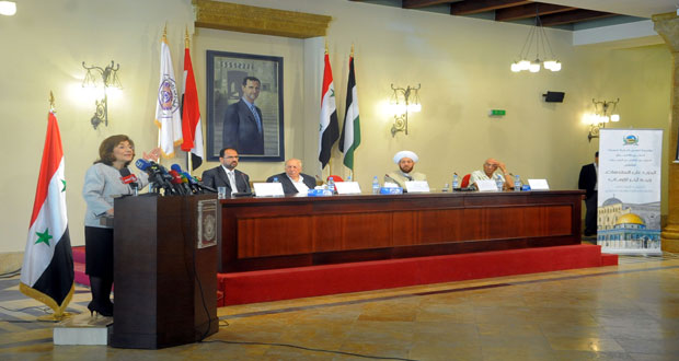 وأكدت المستشارة السياسية والإعلامية في رئاسة الجمهورية رئيسة مجلس أمناء مؤسسة القدس الدولية “سورية” الدكتورة بثينة شعبان أن “هدف العدوان الإسرائيلي على قطا ع غزة تغيير الهوية العربية وحضارتها ومحو آثارها وأوابدها واستبدالها بالهوية الصهيونية وحسم قضية الصراع العربي الإسرائيلي لصالح الصهيونية” مشددة على ضرورة أن يكون العرب أصحاب الفعل والمبادرة والمقاومة.