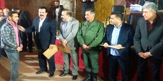 بمناسبة عيد المعلم كرمت نقابة المعلمين عددا من المعلمين والطلاب المتفوقين من أسر وذوي الشهداء وذلك على مسرح نقابة المعلمين في مدينة البعث.