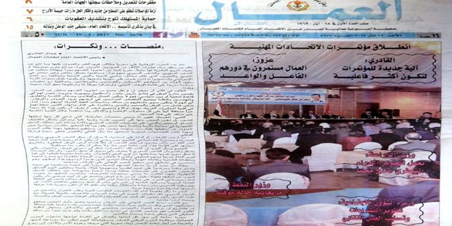 وفي افتتاحية العدد كتب رئيس اتحاد نقابات العمال جمال القادري”مع اقتراب ساعة النصر النهائي على الإرهاب وداعميه يتعمق مأزق المعتدين ومعهم منصاتهم الدمى وكل من تاجر بدماء شعبنا ولقمة عيشه ونصب نفسه وصياً عليه وممثلاً له فالتاريخ لن يرحم الخونة ومعدومي الضمير والأخلاق وستبقى الكلمة الأقوى للشعب فهو صاحب الفصل في تحديد مستقبل بلاده وهو يدرك جيداً من ممثله الحقيقي الذي يحظى بدعمه ومحبته الكاملين”.