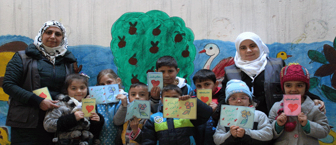 بطاقات معايدة صنعها أطفال تتراوح أعمارهم بين ال5 و ال7 سنوات من الورق الملون وكتبوا عليها عبارات تعبر عن حبهم لمعلميهم ضمن نشاط نظمه مركز مودة للرعاية الاجتماعية “قسم الرعاية النهارية” في حي الخضر بمدينة حمص احتفاء بعيد المعلم.