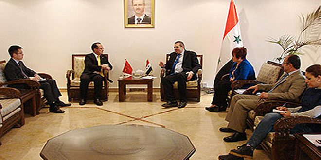 بحث وزير التعليم العالي الدكتور عاطف نداف مع السفير الصيني بدمشق تشي تشيانجين تعزيز التعاون العلمي والثقافي المشترك بين البلدين وسبل تطويره.