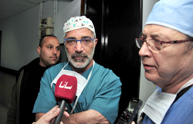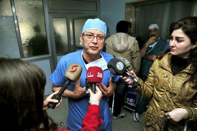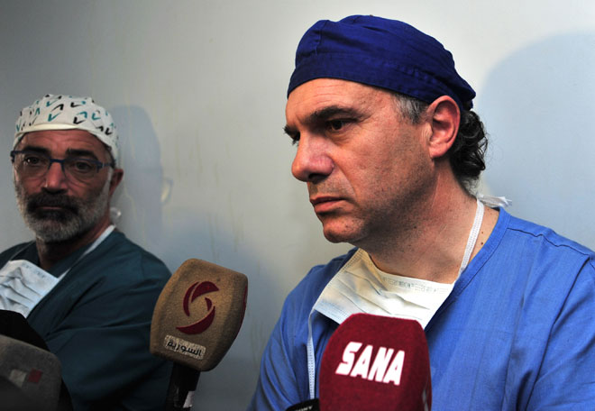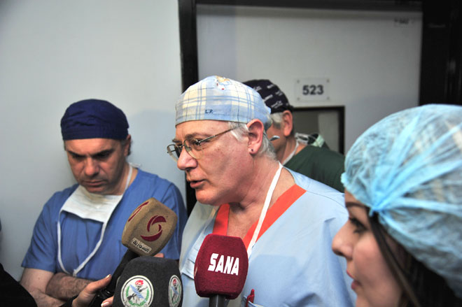 وخلال معاينة الأطباء لأحد حالات الجرحى ذكر الدكتور فابيو ابينابولي أخصائي جراحة تجميلية وفكية أن العملية شملت ترميما للفك والفم واللسان مشيدا بخبرة ومهارة الأطباء السوريين في تعاملهم مع كل أنواع الجراحات فيما أشار الدكتور أنطونيو أخصائي جراحة عظمية إلى أنه تم خلال زيارته الثانية لسورية إجراء 33 عملية أكثر من 20 منها جراحة عظمية.