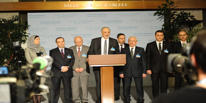أعلن رئيس وفد الجمهورية العربية السورية إلى الحوار السوري السوري في جنيف الدكتور بشار الجعفري أن جلسة محادثات اليوم مع المبعوث الخاص للأمم المتحدة الى سورية ستافان دي ميستورا ركزت على موضوع مكافحة الإرهاب وخاصة في ضوء العمليات الإرهابية التي تستهدف حاليا ريفي دمشق وحماة مبينا أنه تم أيضا إجراء تقييم لمساري أستانا وجنيف بناء على طلب دي ميستورا.