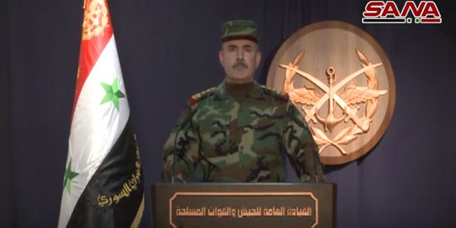 وختمت القيادة العامة للجيش بيانها بتجديد عهدها لأبناء شعبنا الأبي بأنها “ستبقى الحصن المنيع الذي يصون سورية ويحمي ترابها الطاهر وتأكيد عزمها على مواصلة الحرب على الإرهاب حتى القضاء عليه وإعادة الأمن والاستقرار إلى جميع أراضي الجمهورية العربية السورية”.