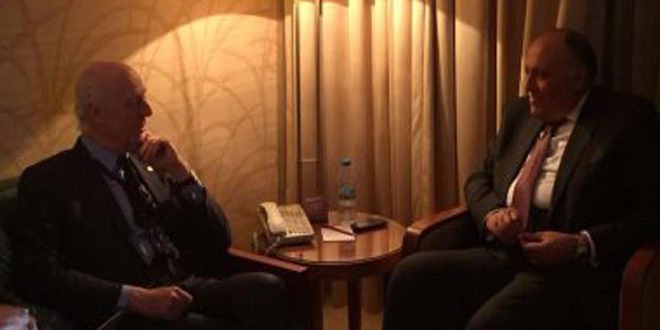 وأعلن المتحدث باسم الخارجية المصرية أحمد أبو زيد أن شكري بحث مع مبعوث الأمم المتحدة الخاص إلى سورية ستافان دي ميستورا في الأردن اليوم “تطورات الأوضاع في سورية والجهود المبذولة للتوصل إلى حل سياسي للأزمة فيها”.