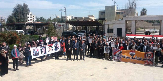 نظمت محافظة القنيطرة بالتعاون مع لجنة دعم الأسرى المحررين والمعتقلين في سجون الاحتلال الإسرائيلي اليوم وقفة تضامنية مع أسرى الجولان السوري المحتل واحتفاء بالإفراج عن الأسير المحرر الدكتور إياد الجوهري وتنديدا بقرار المحكمة الإسرائيلية بتمديد اعتقال عميد الأسرى السوريين والعرب المناضل صدقي المقت وذلك أمام مبنى المحافظة بمدينة البعث.