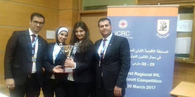 فاز طلاب كلية الحقوق في جامعة دمشق بالمرتبة الأولى في المسابقة الإقليمية في مجال المحاكم الصورية للقانون الدولي الإنساني والتي عقدت اليوم وأمس في جامعة القاهرة بالتعاون مع اللجنة الدولية للصليب الأحمر.