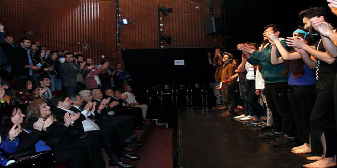 وفي العرض المسرحي الذي قدمه طلبة المعهد على خشبة الراحل سعد الله ونوس لهذه المناسبة من إخراج كفاح الخوص لجأ فيه هذا الأخير لصياغة ما يشبه حالة مسرحية استعارت أجواء امتحان لجنة القبول وهموم النجومية لتكون متنا لعرض احتفالي درجت العادة فيه منذ سنوات على توظيف تمارين الإلقاء والليونة والمختبر المسرحي كي تكون بمثابة لوحات يتم الدمج بينها كيفما اتفق.