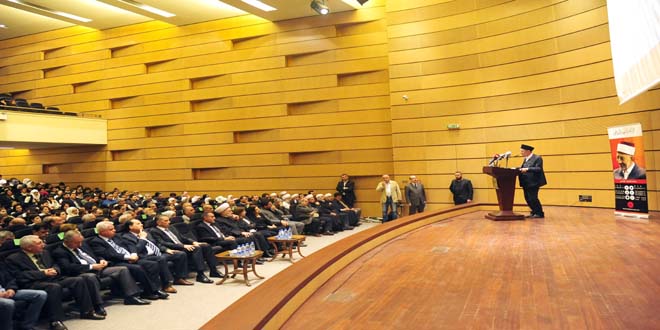 وفى كلمة له أكد معاون وزير الأوقاف تيسير أبو خشريف أن حفل التأبين اليوم يأتى تخليدا لروح الشهيد ومآثره لافتا إلى دعوة العلامة الراحل دائما إلى محبة الوطن والذود عنه والتحذير من الانجرار مما كان يخطط لسورية من مؤامرات.
