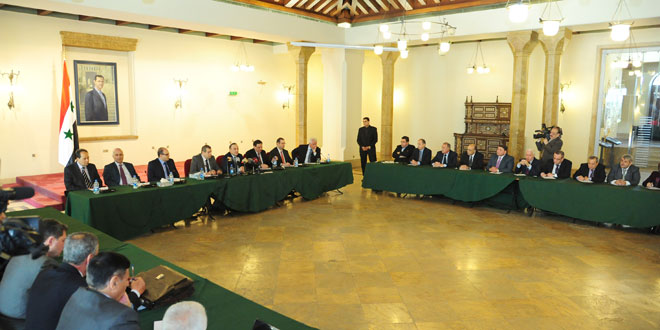 تعزيزا للحوار والنقاش بين الحكومة والخبرات الأكاديمية الاقتصادية في الجامعات السورية وتبادل الرؤى والأفكار بشكل شفاف للوصول إلى رؤية مشتركة “حكومية وأكاديمية” في المجال الاقتصادي التقى المهندس عماد خميس رئيس مجلس الوزراء اليوم أساتذة الاقتصاد في جامعة دمشق وعمداء كليات الاقتصاد في الجامعات السورية العامة والخاصة والإعلاميين الاقتصاديين في وسائل الإعلام المرئي والمسموع والمكتوب والإعلام الالكتروني وذلك في قاعة المؤتمرات بجامعة دمشق.