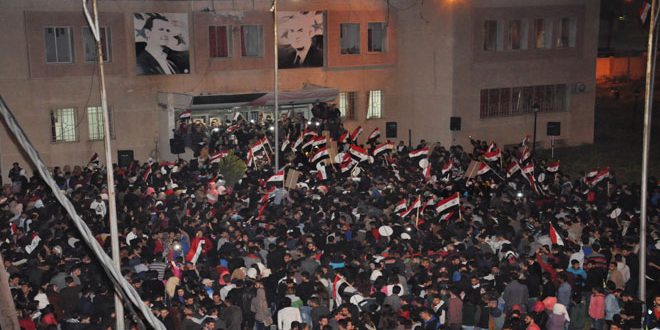وأشار طلال البرازي محافظ حمص إلى أن هذا التجمع الطلابي الحاشد هو تأكيد على أن أبناء سورية هم املها ومستقبلها فهم الذين يتحدثون اليوم باسم الحاضر والمستقبل ويتحدون أمريكا مخاطبين العالم بأن كرامة سورية وعزتها وتاريخها تكتب بدماء أبنائها المدافعين عنها قائلا إن “سورية لا تجرب ولا تهدد فهي كانت وستبقى قلب العروبة النابض وأرض البطولات والفداء”.