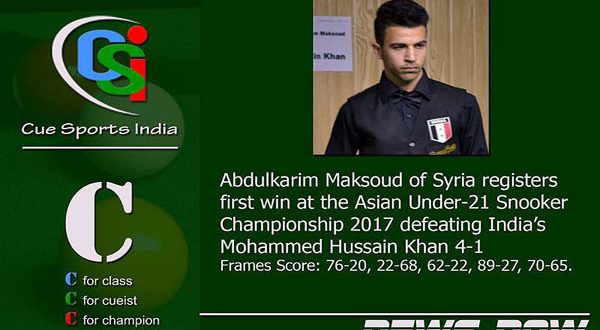 يواصل لاعبو منتخب سورية للسنوكر تألقهم في منافسات بطولة آسيا تحت 21 عاما المقامة في الهند حاليا حيث تأهل عبد الكريم مقصود الى دور ال16 من البطولة بعد فوزه في مباراتين متتاليتين.