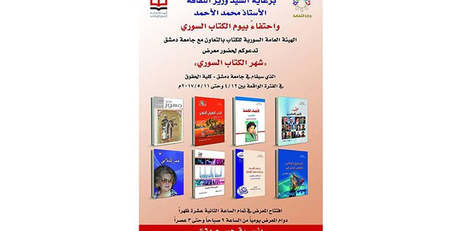 احتفاء بيوم الكتاب السوري تقيم الهيئة العامة السورية للكتاب بوزارة الثقافة بالتعاون مع جامعة دمشق عند الثانية عشرة من ظهر غد معرض شهر الكتاب السوري بحسم 60 بالمئة على جميع الإصدارات وذلك في كلية الحقوق بالجامعة.