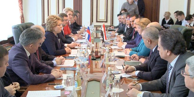 وقالت ماتفيينكو خلال لقائها وفد مجلس الشعب السوري في موسكو إن “العلاقات الروسية السورية متينة جدا لأنها مبنية على أسس الصداقة العريقة بين بلدينا.. وروسيا كانت ولا تزال تعمل على مكافحة الإرهاب الدولي وعلى تسوية الأوضاع في سورية” داعمة قولها بالمثل الشعبي أن “الصديق عند الضيق”.