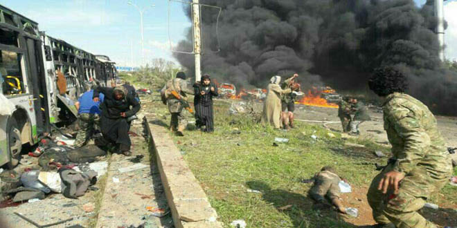 وارتقى في وقت سابق اليوم عدد من الشهداء وأصيب عشرات المدنيين نتيجة تفجير إرهابي بسيارة مفخخة استهدف منطقة تجمع الحافلات التي تنقل أهالي بلدتى كفريا والفوعة في منطقة الراشدين غرب حلب.