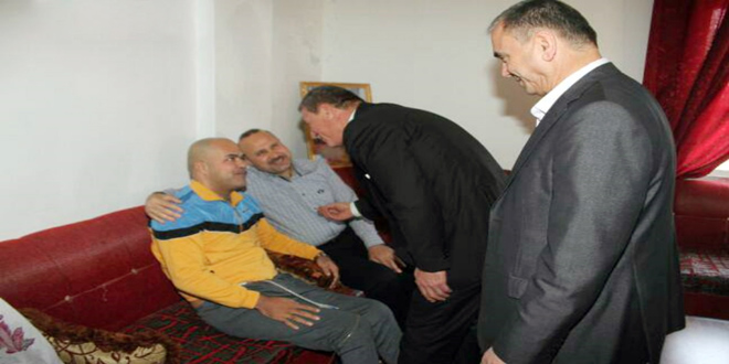 بعد ذلك وتنفيذا لتوجيهات الحكومة الاهتمام بأسر الشهداء والجرحى زار المحافظ الجريح غياث علي ديوب الذي يعاني نسبة عجز تعرض لها جراء إصابته خلال تصديه للمجموعات الإرهابية المسلحة في مدينة حلب مؤكداً أنه سيتم تقديم كل ما يحتاجه الجرحى من علاج ومستلزمات وهذا أقل واجب لمن قدموا أنفسهم في سبيل الوطن.
